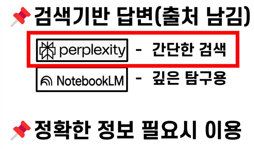 - 퍼플렉시티(Perplexity): 질문에 대한 답을 인터넷에서 찾아 정리해 주고, 어떤 사이트에서 가져왔는지 출처 주석을 달아줍니다.