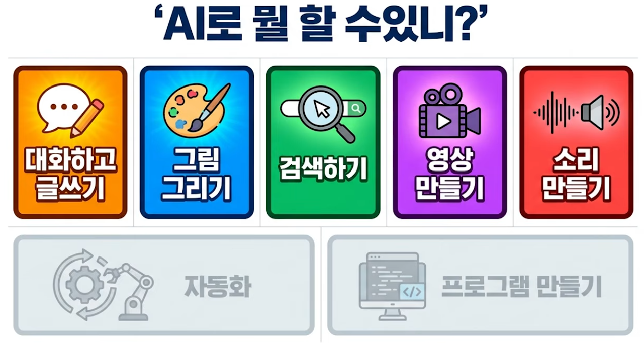 너무 많아서 고민되신다면 '제미나이(Gemini)' 하나부터 시작해 보세요! 대화, 글쓰기, 그림 그리기, 유튜브 요약까지 다 되기 때문에 일상생활에 가장 큰 도움이 될 것입니다.