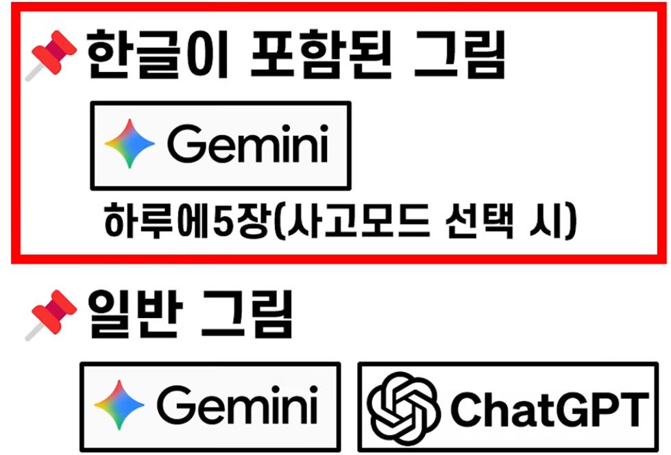 - 챗GPT: 이미지 생성은 가능하지만, 한글 텍스트 표현이 조금 뭉개질 수 있습니다.