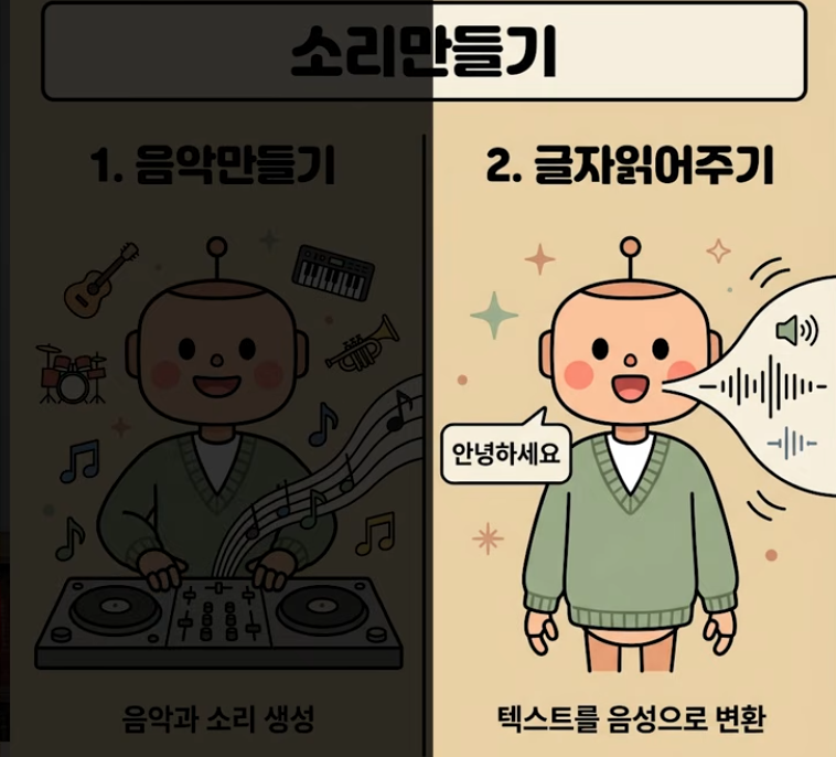 - 수노(Suno): 가사만 입력하면 트로트, 발라드 등 원하는 장르의 노래를 뚝딱 만들어 줍니다.